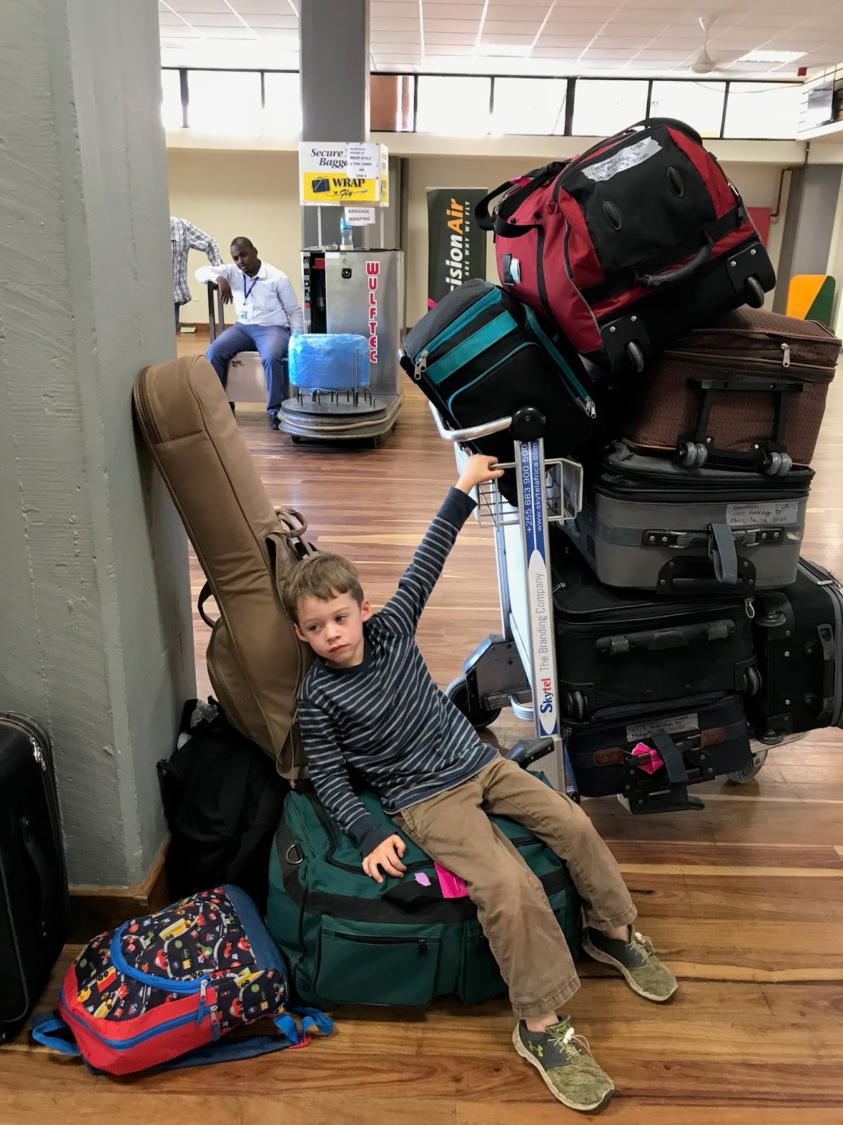Silas guarding the bags while Jacob checks in at the counter in Tanzania